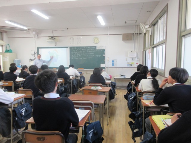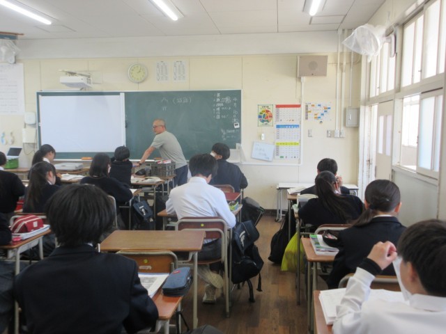 (下の写真)3年3組の英語は、C-NETの先生との授業です。難しい英文の和訳や発音にも挑戦する姿が見られました。Great!
