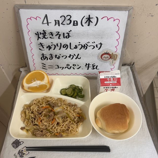 今日の給食の献立は『焼きそば、きゅうりのしょうがづけ、あまなつかん、ミニコッペパン、牛乳』でした。