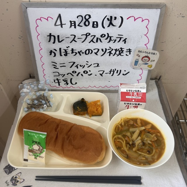 今日の給食の献立は『カレースープスパゲッティ、かぼちゃのマリネ焼き、ミニフィッシュ、コッペパン、マーガリン、牛乳』でした。
