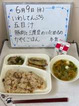 今日の給食の献立は、「いわしてんぷら 五目汁 豚肉と三度豆のいためもの かやく...