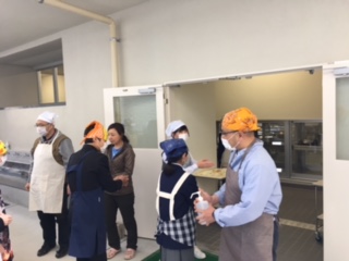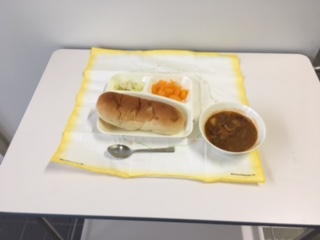 本日、給食が始まりました。初日になります。給食棟へ昼食を取りに行き教室で配膳を行い、いただきました。今日のメニューは、ビーフシチュー、キャベツのピクルス、缶詰めミカン、パン、牛乳です。