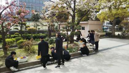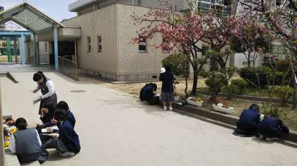 桜の木や中庭に咲いているお花のスケッチをしています。