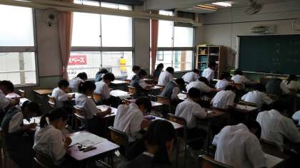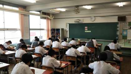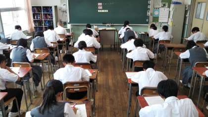 本日、1年生は社会、理科、技術・家庭の3教科です。最後までしっかりとテスト問題に向き合っています。