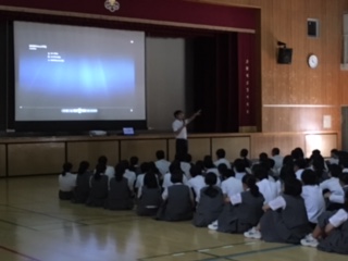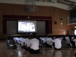 先ず、余越先生から、「学習面」についてのお話がありました。規則正しい生活、体力作り、ちょっとぐらいという気の緩みの危険性などについて話がありました。続けて、矢野先生から「日本の良さ」について進路とからめた話がありました。最後に、修学旅行の思い出ビデオを上映しました。