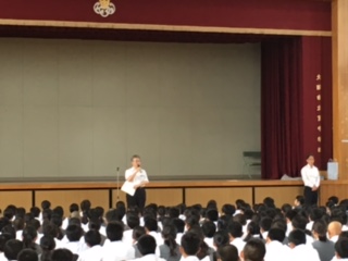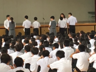 はじめに部活動表彰があり、剣道部と体操(校外活動)の生徒たちが表彰されていました。校長先生より、毎回たくさんの表彰がおこなわれ「菫ブランド」の向上に貢献していただていることに感謝します、とのお言葉がありました。