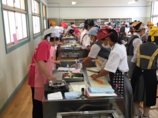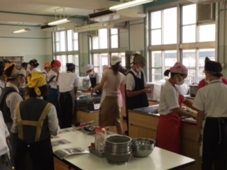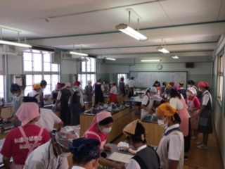 3限の調理実習の様子です。本日は、城東区役所の管理栄養士の先生および食生活改善推進員協議会の皆さま計、そして有志のボランティアの先生の合計9名にお越しいただき実習の指導をしていただきました。主婦歴何十年の大ベテランの先生ばかりで、教員ひとりではなかなか手の届かない細かな指導をしていただけて本当に助かりました。ありがとうございました。
