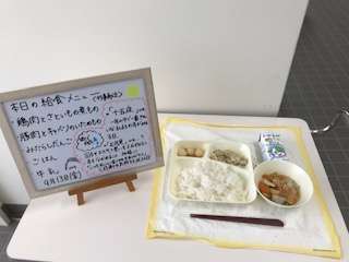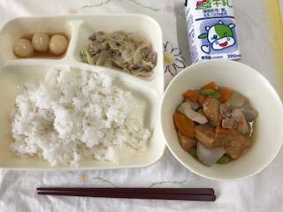 鶏肉とさといもの煮もの、豚肉とキャベツのいためもの、みたらしだんごといったメニューでした。みたらしだんごが一番好評で、タレまできれいに食べてくれているクラスもありました。