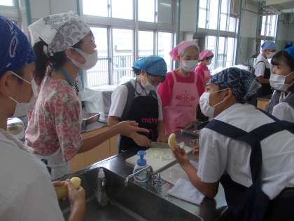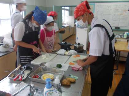 お世話になった食生活改善推進協議会の方々ともリラックスして、なごやかに交流する様子が見られました。サポートしていただいた方に、「誰が一番料理上手でしたか?」と質問している班もありました。おうちでふだんからお手伝いしていると、調理実習でも手際よく作業できます。今回の調理実習のメニューを、ぜひおうちでもご家族のために作ってみてください!!