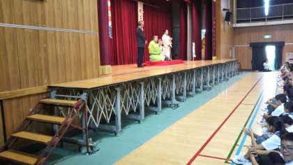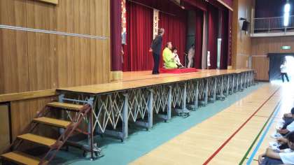 落語体験コーナーに1年生の男女が舞台に上がりました。