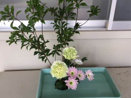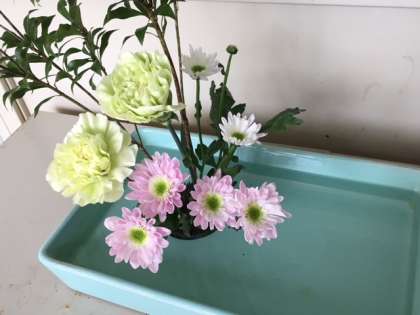 昨日、新しい花を生けていただきました。薄黄色と薄ピンクの花々の可憐な姿。ぜひ間近で観賞してください。