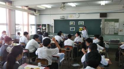 給食時間に本校では、給食を食べるだけでなく、食育を行っています。