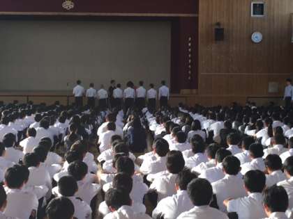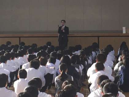 部活動表彰(野球部、剣道部)のあと、校長先生から前回の学年集会で講話をしてくださった四条畷市教育長の植田先生から、皆さんの「傾聴する」姿勢についてお褒めの言葉を頂戴したことと、「数理」「論理」「倫理」の大切さについて話がありました。