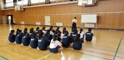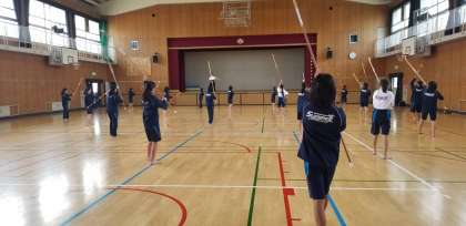 体育館では1,2年生が薙刀の授業を受けていました。講師の先生に来ていただき丁寧に指導していただいていました。凛々しい姿です。