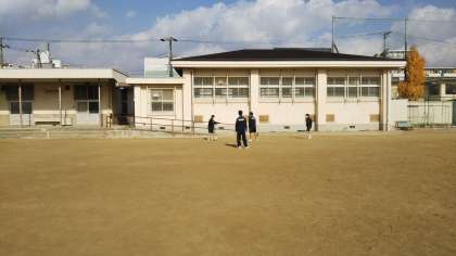 3限目の5・6組の保健体育の授業は、体育館では、女子の薙刀の授業が行われ、グランドでは男子がサッカーを行っています。