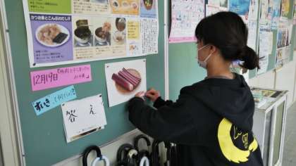 食に関する情報が掲示されています。私たちが、毎日いただいている給食について深く知ることで、更に美味しくいただけますね。