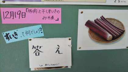 本日の給食で提供していただく「ずいき」についてのクイズが出題されていました。