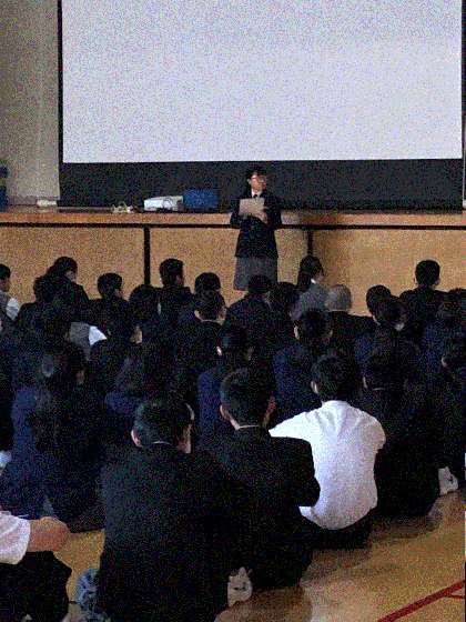 集会では来年度の修学旅行の行先・目的と、今後の事前学習の取り組みについて話がありました。
