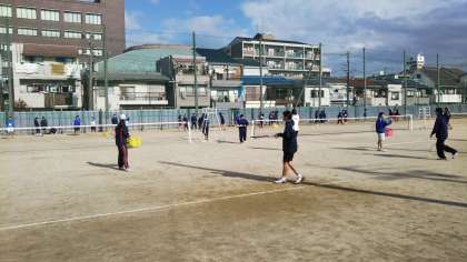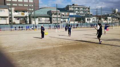 ソフトテニスで基本的なプレーである、フォア・バックのストローク練習をしています。