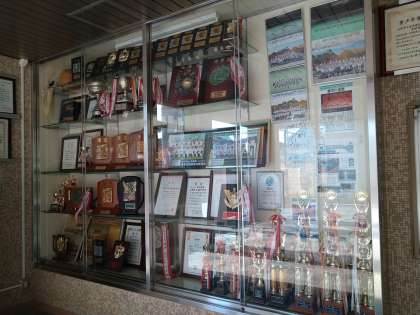 今日は、菫中学校の玄関口に展示しています「部活動の栄光の軌跡」を写真でお伝えします。これまでの先輩方が手にされた、数多くの入賞トロフィー・カップ等が数多く並んでいます。