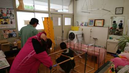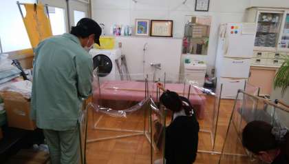 保健室をのぞくと、養護教諭、助教諭の先生と管理作業員さんがビニール製のシールドを作成していました。飛沫をふせぐためのもので、教卓に置いて使用する予定です。