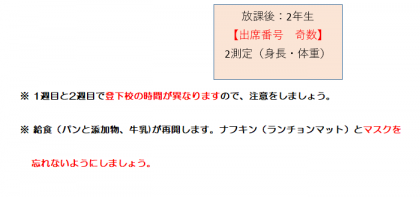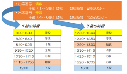 明日は、午前登校が出席番号の偶数です。午後からは、奇数番号となります。