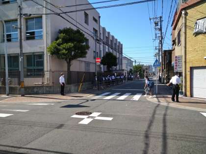今朝も多くの先生方が、みなさんの登校を正門で出迎えております。交通量の多い所では、校長先生を含め、多数の先生方で見守っております。