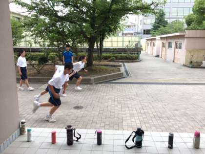 1年生5限目の体育の授業風景です。グラウンドがぬかるんでいるため職員室前の中庭でクラウチングスタートの練習をしました。