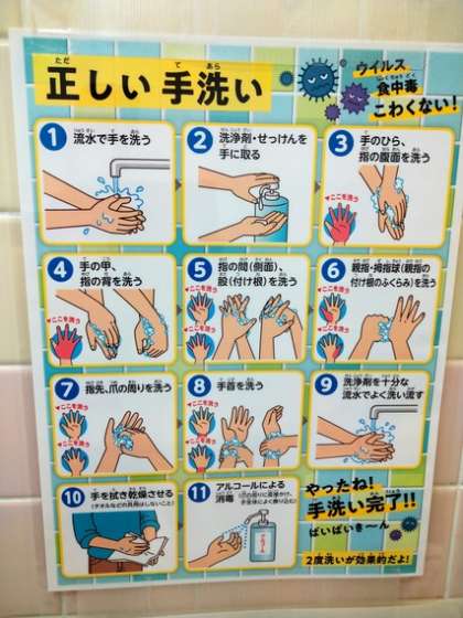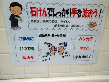 手洗い場やトイレに「手洗いの仕方」のポスターが掲示されています。