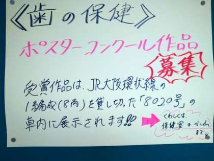 「歯の保健」について、ポスターコンクール作品の募集のお知らせが、保健室前に掲載されていました。受賞作品は、JR環状線の1編成(8両)を貸し切った「8020号」の車内に展示されます。「8020」は、80歳になっても自分の歯を20本以上保とう!という運動です。