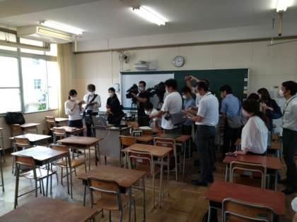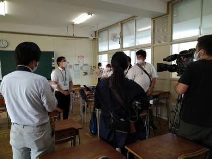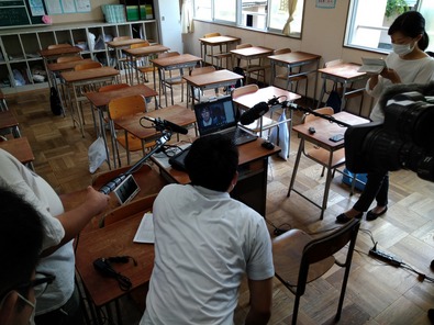授業を終え、今回のオンライン学習の成果について、山本先生がメディアのインタビューを受けています。また、学校を代表して生徒会の生徒が「オンライン」でインタビューを受けています。とてもきちんと答えていました!