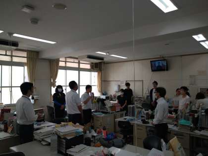 職員室では、3年生の先生方が授業を終え、意見交換をされていました。