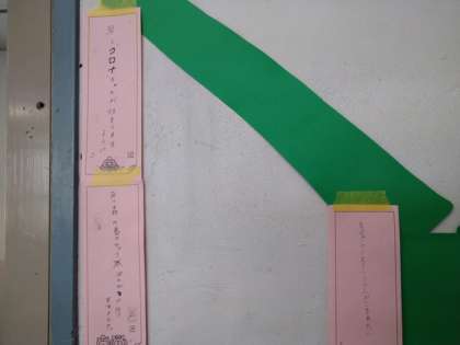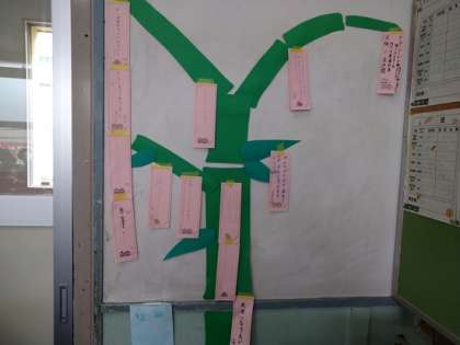 しかしながら、2年生の学級に温かい空間を発見しました。手作りの七夕の「笹」と「短冊」が飾ってありました。