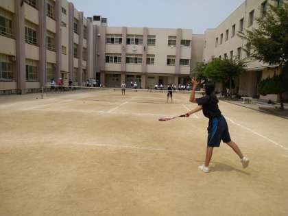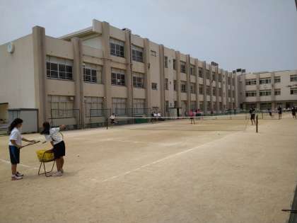 中庭テニスコートでは、ソフトテニス部が練習をしていました。