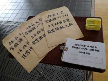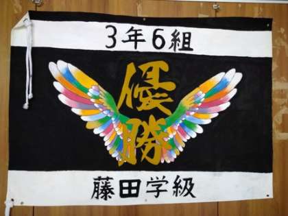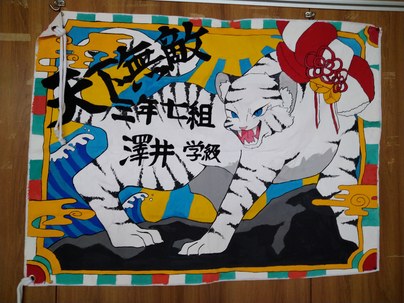 賞のこともありますが、大切なのは、クラスの仲間が協力して作品を完成させたことですね。各クラス、この学級旗の下、体育大会、全力で取り組んでください!