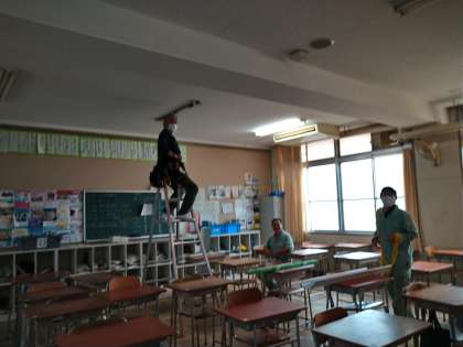 放課後は、体育大会係別会議、部活動とみなさんがそれぞれの取り組みを行っている中、1年生のクラスでは、管理作業員の方々が電灯を替えてくれていました。