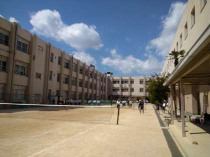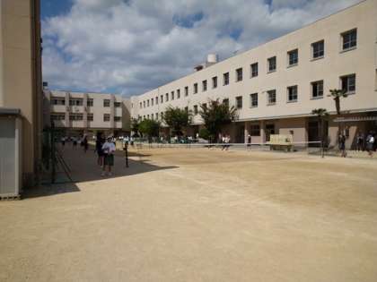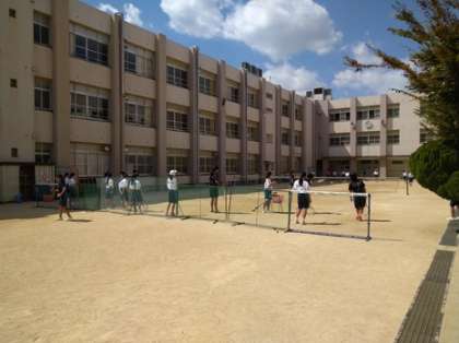 いい天気の下、中庭では、ソフトテニス部が活動をしています。