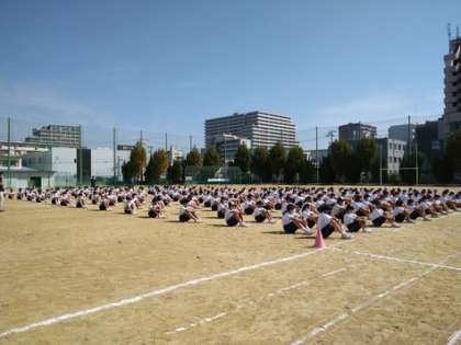 先ず最初にラジオ体操を行い、続いて学級でミーティングを行いました。その後、実際に全員リレーを行いました。