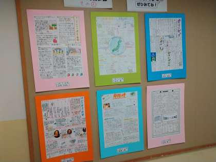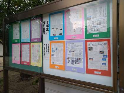 廊下や中庭の掲示板に「2年生の歴史新聞」が掲載されていました。