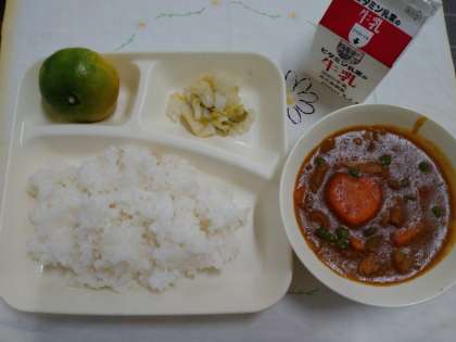 ☆きょうの給食☆〜ポークカレーライス(米粉)、はくさいのピクルス、、みかん、牛乳〜