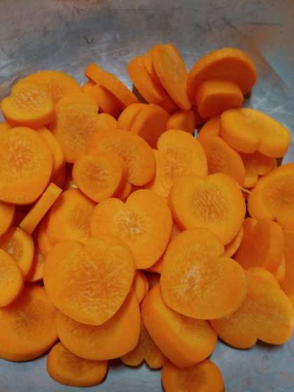 給食調理員さんに、ラッキーニンジンを入れていただきました。今回は「ハート」の形です。皆さんお味はいかがでしたか。