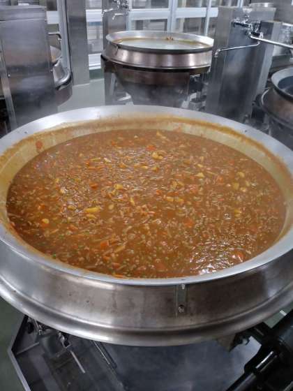 きょうの給食は「ポークカレーライス」でした。野菜が煮あがり、カレールウを煮汁で溶いただけで、よいにおいが給食室いっぱいに立ちこもり、一気におなかがすいてきます。給食棟の外でも「今日はカレーや!」と、においで分かるようですね。きょうのカレーライスは、小麦粉ではなく米粉を使用したルウを使い、小麦アレルギーの人も食べられるものになっています。また、今月の給食では、ハヤシライスとコーンクリームシチューも小麦粉を使用せず、米粉を使用して作っています。