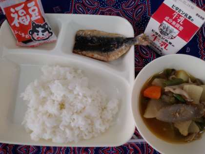 ☆節分の行事献立☆ 〜いわしのしょうがじょうゆかけ、含め煮、いり大豆、ごはん、牛乳〜
