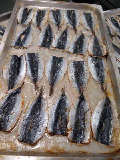 給食室では生のいわしを鉄板に並べ、焼き物機で焼いていました。大きさは、焼くとひと回り小さくなり、代わりに香ばしいにおいでいっぱいになりました。いわしはオメガ3(スリー)といわれる脂肪酸が多く、皆さんにもしっかり食べてほしい食材です。好き嫌いせず、しっかり食べて体調を整え、丈夫な体作りをしましょう。