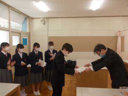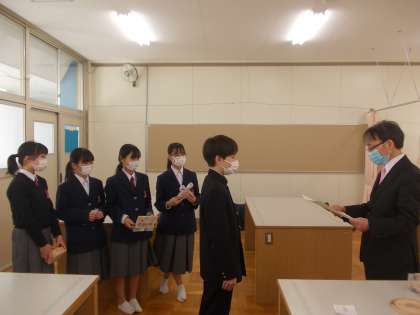 先日、校長先生に賞状を授与していただき、「初めての応募で入賞、素晴らしい!」と言葉をかけていただきました。来年度の目標は最優秀賞で、考えた献立が給食に登場することをめざしています。これからもみんなでがんばっていきたいと思います。