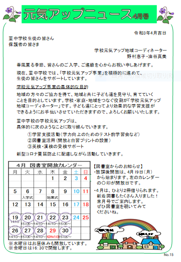 今年度も引き続き、元気アップニュースを発行いたしますので、ご確認をお願いいたします。図書館に関する情報をたくさんお伝えいたします。