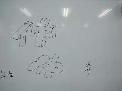 学習している前にホワイトボードがありました。そこに目を移すと、上手に書かれた文字がありました。「仲」という文字は、仲良しの仲でしょうか?