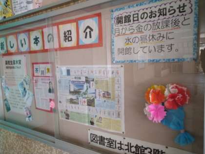 正門を通り、正面入り口玄関の所に「図書室からのお知らせ」が掲載されていました。