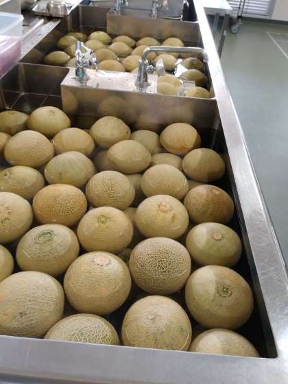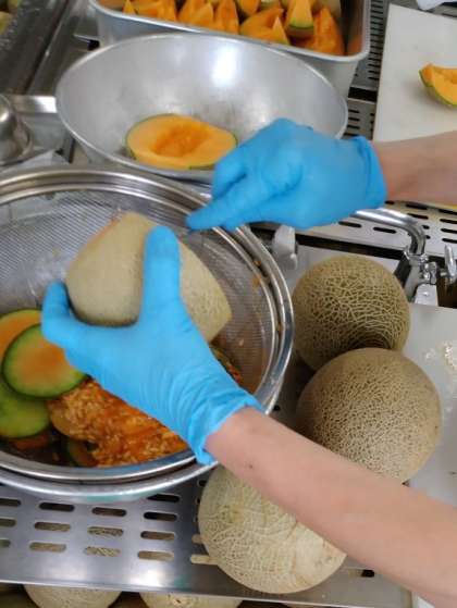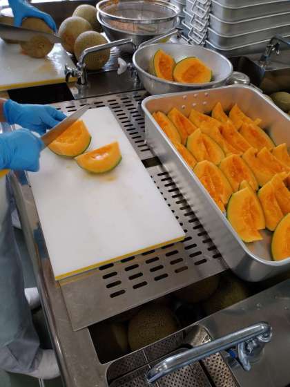 メロンはへたを切り落として二つ割りにし、種を取り除いてから1/8に切り分けます。