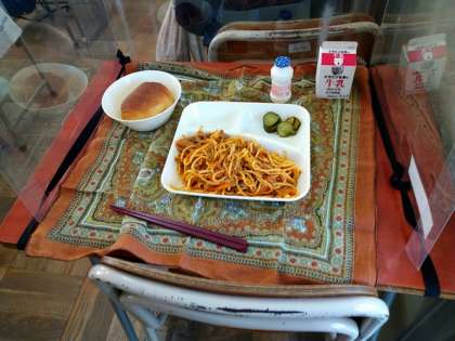 今日は、スパゲティミートソース、きゅうりのピクルス、発酵乳、黒糖パン(小)、牛乳でした。