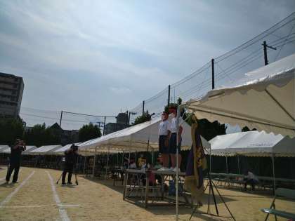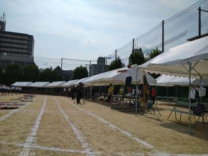 力強い選手宣誓のあと、競技上の諸注意、競技プログラム1番のラジオ体操第2と続いています。